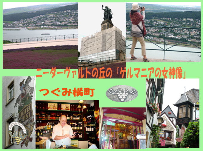 一面ブドウ畑が続くニーダヴァルトの丘にある1871年のドイツ帝国成立の記念碑、【高さ38Mのゲルマニアの女神のブロンズ像】があります。ここで、少しカメラタイムがあった後、通りの入口に【つぐみ】のレプリカがある【つぐみ横町】へ。ここにはワインレストランが軒を並べ昼間から生演奏も聞こえてくるし、沢山の種類のワインが売られています。8月にはワイン祭が行われます。