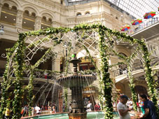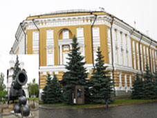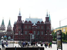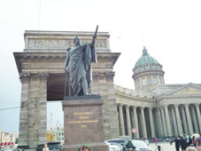 | カザン聖堂:両腕を伸ばした様な長い回廊が美しいです。1612年のポーランド撃退以来、ロシアの守護神となったカザンの聖母のイコン(板に書いた画像)を安置する為に建てられた。ロシア正教では珍しいカトリック風の回廊があり、上から見ると十字架の形をしている。*真ん中の貴族の礼装をした人は記念撮影用のパフォーマーでカメラを向けるにはお金が要ります。 |
