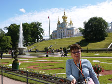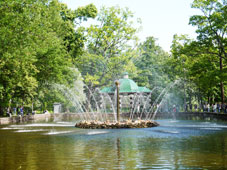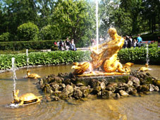 | ペテルゴーフ ピョートル大帝の夏の宮殿で【ピョートル大帝の宮殿=ペトロヴァリエーツ】と呼ばれる、フィンランド湾に面した美しい噴水と庭園が見事です。海から段々とテラス状に高くなるペテルゴーフの地形に注目したピョートル大帝が水を活かした宮殿を構想、1723年に、死の2年前に完成した。【上の庭園=フランス式の庭園】と【下の庭園=噴水群】でなっている。 |