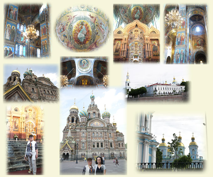| 血の上の教会:モスクワのワシリー寺院とよく似ています。1881年に皇帝アレクサンドル2世が暗殺された場所の上に建てられている。1907年完成と比較的新しい建物です。天井一杯のモザイク画には圧倒されます。 |