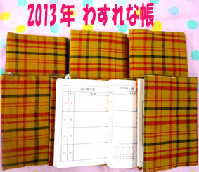 2012年9月 加齢と共に忘れることが多くなってきたので、今までとは違う手帳【ボケ防止手帳】を由起先生が考案して下さいました。色々と試行錯誤されて14冊目にやっと、皆が作るひな型、お手本を完成させて下さいました。 私はstartが遅れて8月28日から取り組みました。私は夜間部ですので、由起先生を一人占めにして、ご指導して頂きました。細かい注意事項を丁寧にご指導して頂きました。 半幅帯をカバーに使い由起先生にミシン掛けをして頂いたり・・・ おそろいの6冊が出来上がりました。 差し上げる分には【わすれな帳】です、と言って貰って頂きます。 |