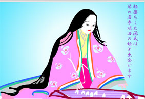 2012年11月 今月は【明石の姫宮】です。 桐壷帝の正妻、弘徽殿の女御(きりつぼていの正妻こきでんのにょうご)の恨みを受けて、源氏は、都落ちをして数人の家士だけを供に須磨へ逃れます。 大嵐で住居が大きな被害を受けて困っていたところへ明石の豪族、明石の入道が助けに来て源氏一行を明石へ迎えます。そこで、物静かで琴の名奏者、【明石の姫宮】を知ります。明石は懐妊して女の子を産みますが自分の手では育てられず、紫の上が養母として育て上げます。きれいなグラデーションの背景は由起先生にご指導頂きました。 |