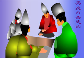 2012年12月 12才で葵の上と結婚した源氏。高貴な生まれの彼女には源氏に対してもやさしい気持ちで心を広げる事は出来ない。母に瓜二つの藤壺の宮を恋い慕う源氏。 宿直所(とのいどころ)に集まった3人の男性、頭中将、惟光、藤式部丞は源氏の反古紙(ほごし)を見つけて、源氏に相手のことを色々と聞き出そうとする。男4人は上品・中品,下品(じょうぼん・ちゅうぼん・げぼん)の格の女性を取り上げて良否を語り合う。 おさげ髪のおとら式部が古文の時間に桝井先生から受けた時間の事が懐かしいです。 |