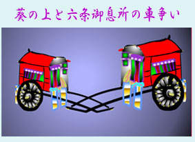 2013年5月 【葵の上と六条御息所の車争い】 懐妊した葵の上は気分のすぐれない毎日を送っています。気分転換の為にと出掛けた賀茂の祭りで場所取りをめぐって六条御息所の車といさかいを起こし、御息所の車は長押 なげし をへし折られ隅へ追いやられます。辱めを受けた六条御息所は精神に異常をきたし、遂には葵の産屋にまで生き霊となって現れ、その姿をみた源氏にまで嫌われていきます。 若き宮廷の官吏が集うサロンの女主人として教養に富んだ素敵な貴婦人の御息所が壊れて行く姿、私の好きな登場人物でしたので心が痛くなりました、 |