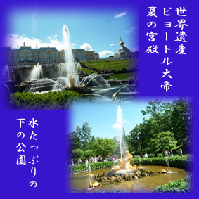 2013年8月 ピョートル大帝夏の宮殿 【下の庭園 噴水群】 サンクトペテルブルグ、2番目の目玉、エカテリーナ宮殿に隣接するとっても美しい噴水群のお庭です。 ピョートル大帝の夏の宮殿で【ピョートル大帝の宮殿=ペトロヴァリエーツ】と呼ばれる。 フィンランド湾に面した美しい噴水と庭園が見事です。 海から段々とテラス状に高くなるペテルゴーフの地形に注目したピョートル大帝が水を活かした宮殿を構想、1723年に、死の2年前に完成した。 汗ばむ陽気でしたが、沢山の美しい噴水に涼しさを感じさせて貰って一息つきました。 |