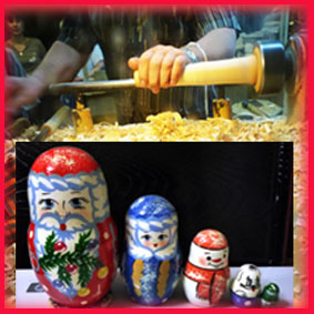 2013年9月 マトリョ−シカ工房見学(2013.6.10) 熟練の匠の太い腕で、1本の丸い木からか先ずは一番大きなマトリョーシカの胴体と顔の部分が削り出されます。 次いで先のマトリョーシカの首の部分にピッタリとはめ込まれるように2番目の胴体と顔の部分が削り出されます。 1番大きいマトリョーシカが13p、5番目は2pの高さです。 アット言う間に1セット5体が産み出されます。 別のお部屋で色付けがされるそうです。女工さんが多いそうですが、私達が見学に行った日は、絵付けの部屋は見学者の体験絵付けで貸し切りでしたので、熟練者の絵付けは観る事が出来ませんでした。 マトリョーシカと言われる入れ子人形が発案されたのは今から100年以上も前のことです。当時イースターエッグの彫刻家の一人セルゲイ・マルーティン氏が箱根の「福るま」を見てヒントを得、イースターエッグと福るまのアイデアを結合させて作り出したのがこの人形でした。 |