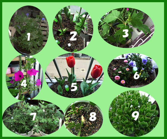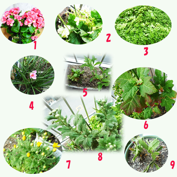 1=柏葉あじさい (未だ元気な葉っぱが残っています) 2=カニシャボテン(新芽が次々と出てきています)