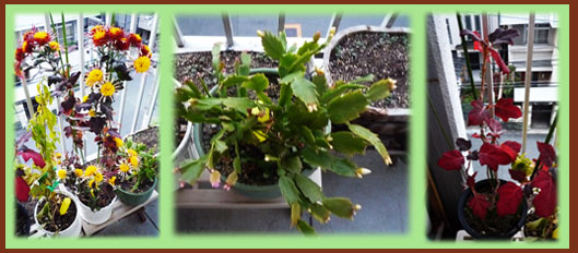 糸菊、枝はそれほど勢いがあるわけではないのにつけていたつぼみが全て開花、忘年会の今日、最後の見頃にしてくれました。咲き始めは黄色でしたが、中旬頃からは赤色が入って美しい花を楽しませてくれました。カニサボテンも今年こそ開花してくれるのか先端がかなり膨らんできています。これからは水やりを控えて暗い場所へおくのが良いとみちえ様に教えていただきました。クリックしてください(白いつぼみが大きく膨らんでいます)柏葉紫陽花は真っ赤に紅葉しています。 |