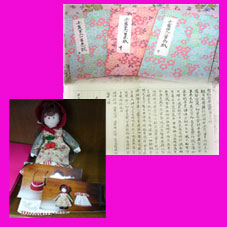 | 【 でこちゃん】羽織⇒お洒落丈長ブラウスとご主人様のアスコットタイ。襟ぐりに苦心の一手。リボン・tieがとっても魅力的です。 | 【こうちゃん】美しいバラのタペストリーと沢山の刺し子の布巾。この布巾、美し過ぎて実際には使うのをためらってしまいそう。 | 【みすず様】百人一首小筆書き・満願達成の写経そして可愛いす〜ちゃん人形。 辛抱は金・・ひき臼は石。有難い金言に出会えました。 |