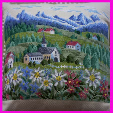 【みちえ様】我が家の植物と共に。実際にお庭を見せて頂きましたが、沢山のメモリアルには毎日注がれた愛情に応えた植物の生き生きしたさまが・・・ | 【YUさん】クロスステッチ・クッション。 スイスアルプスの牧場でしょうか?壮大な風景。ソファーに置いて・・は勿体無いですね。 是非背もたれではなくて鎮座まします場所に丁寧においてくださいね。 |