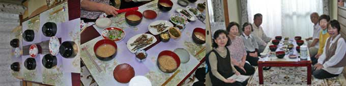 吉野生まれの礼子さんに茶がゆを食べて頂きたい、ひろしさんも来て頂ければ、イベントの度に、教室までのアッシー君を引き受けて下さる弥次さんにもお声掛けが出来るし・・・・とこの3人を主賓(あの食事で主賓?はないですね・・)に【茶粥・ウルメ刺し・梅干・塩昆布】だけの、粗末な、普段通りの茶粥を食べる会を持ちました。今迄にも数回、ほんの数人の茶粥会はしたことが有りますが、今回は私を含めて10人の大所帯になってしまいました。 |