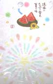 | 【和紙の暑中見舞い】風鈴・スイカ・ひまわり、其々が皆浮き出し(印刷用語では、【箔押しはくおし】)になっています。(かつ子さんから) |