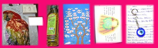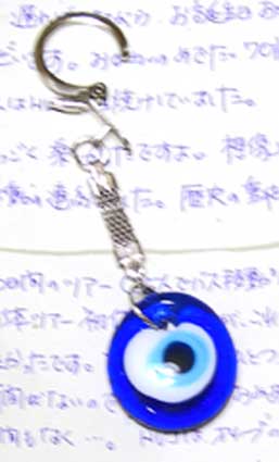 【左から】トルコ名産のオリーブ100%の石鹸・オリーブオイル・ポーチ(トルコの代表的なタイル柄です)・絵ハガキ・綺麗な石のキーホルダー(お土産の入っていたビニール袋には、綺麗なおうむが印刷されていました)クリックして下さい。カラス避けの目玉の様な綺麗なキーホルダーをご覧ください。ポーチにも同じ石の小さいストラップが付いています。