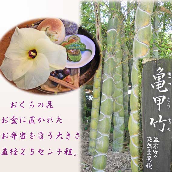 画像をクリックして下さい。(亀甲竹 きっこうちくとオクラの大きな花が見えます) |