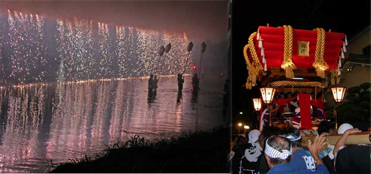 19:30.いよいよ、お神輿と布団太鼓が川の中へ入っていきます。何時もならかなり深いところまで入っていくそうですが、今年は大雨の後、万一事故でも起きたら・・とほんの少しだけ水に入って【足洗い神事】は終り。(例年はナイアガラの滝の花火を背景に布団太鼓の写真が撮れたのに・・と三脚を立てて場所取りをしておられた、隣の老婦人はとっても残念そうに早々に三脚を片付けておられました)
